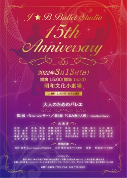 お陰様でJ・B Ballet Studioは15周年を迎え、大人のためのバレエの発表会を下記の通り行う事となりました。